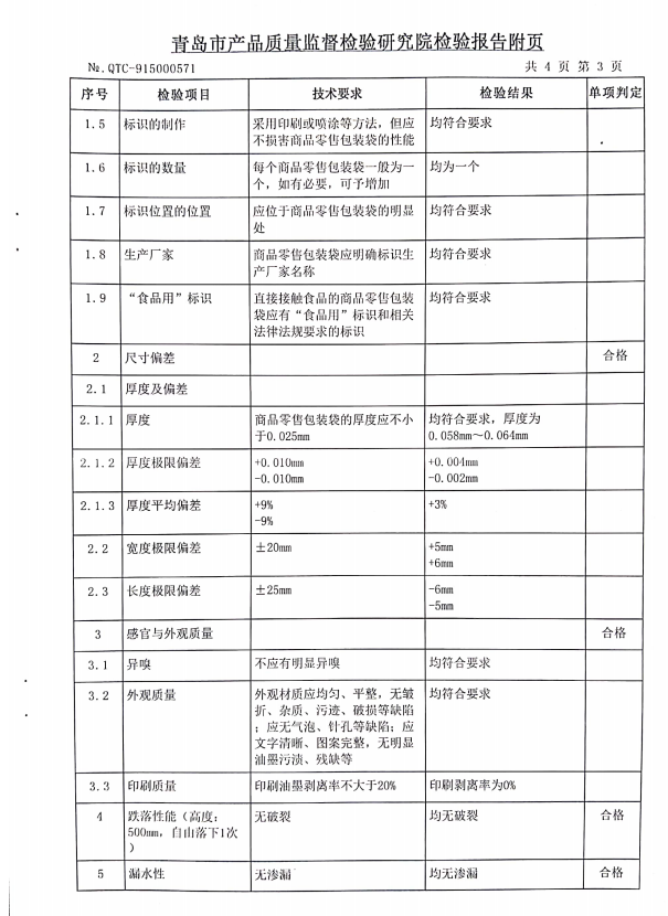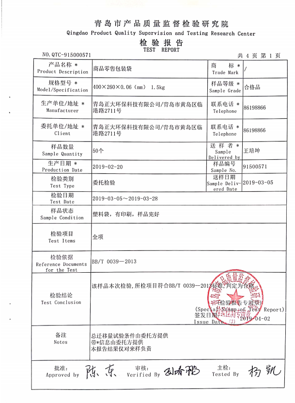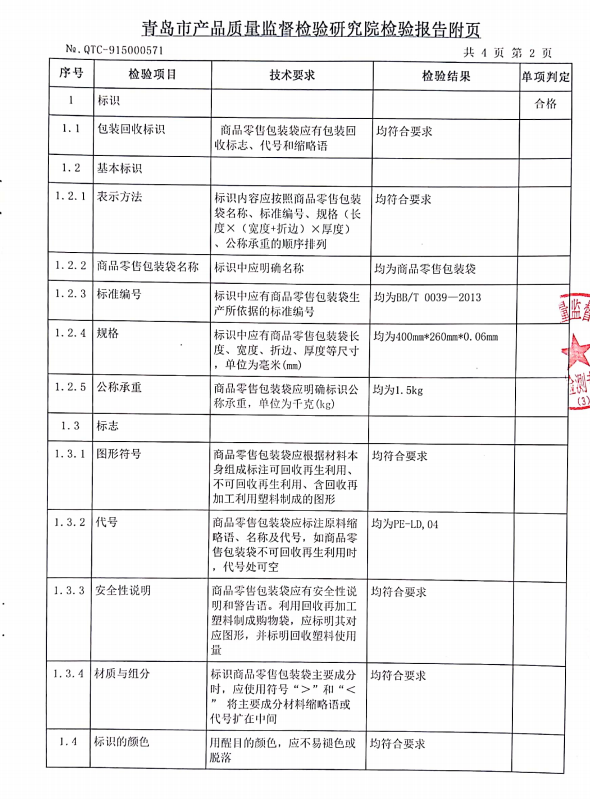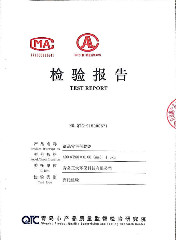 青島91视频官网環保(bǎo)生產(chǎn)的零售商品包裝袋400*260*0.06mm順利通過青島質量監督檢查院檢(jiǎn)測
