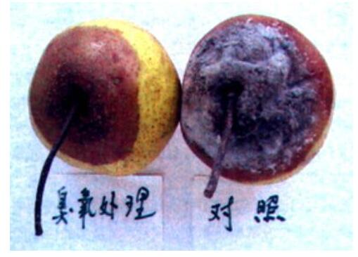 常溫(wēn)下臭氧處理(左)和對(duì)照(右)的雪花梨的(de)腐爛程度比較上圖顯示(shì)的是臭氧處理(lǐ)的雪花梨和(hé)對照果腐(fǔ)爛(làn)程度的比較,在上表中的腐爛果統計(jì)中它們肯定均屬於腐爛果,但是(shì)就其腐爛(làn)程度而言,兩者是(shì)有明顯區別的,經臭氧處理的雪花梨,其腐爛病斑的發展和病原菌絲體及孢子的形成均比對照果慢。