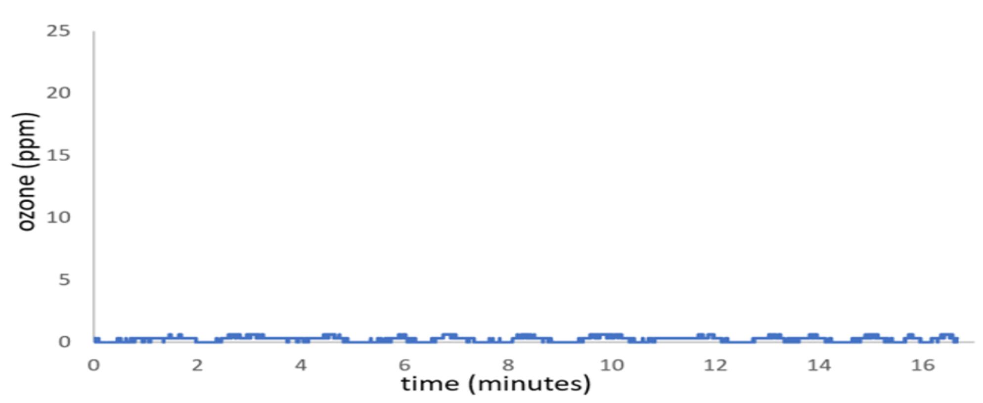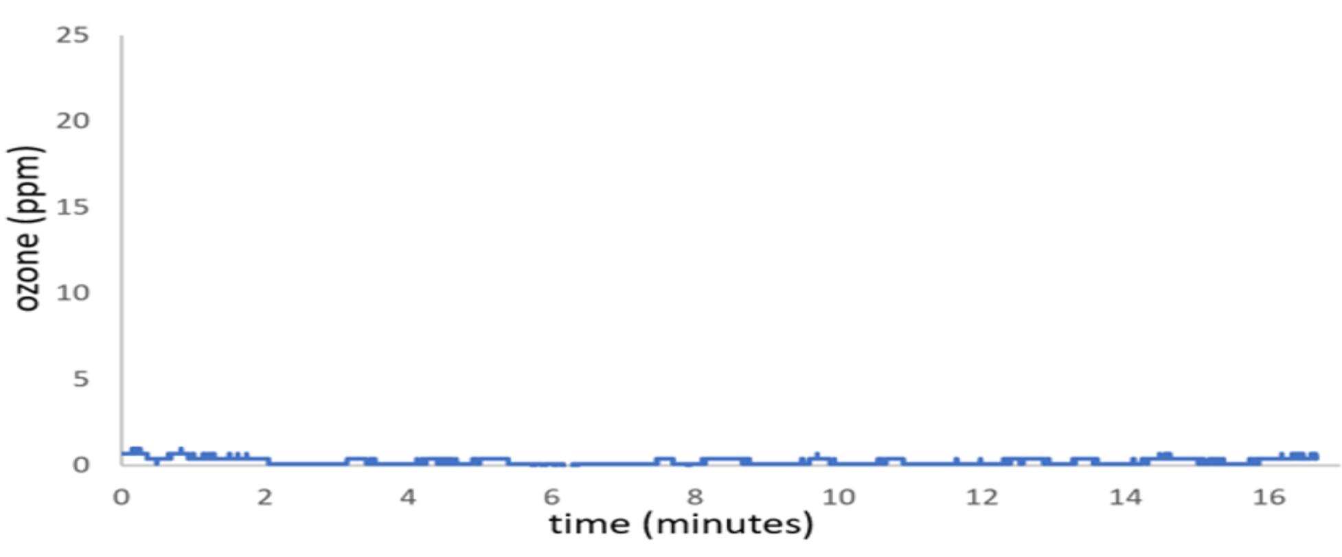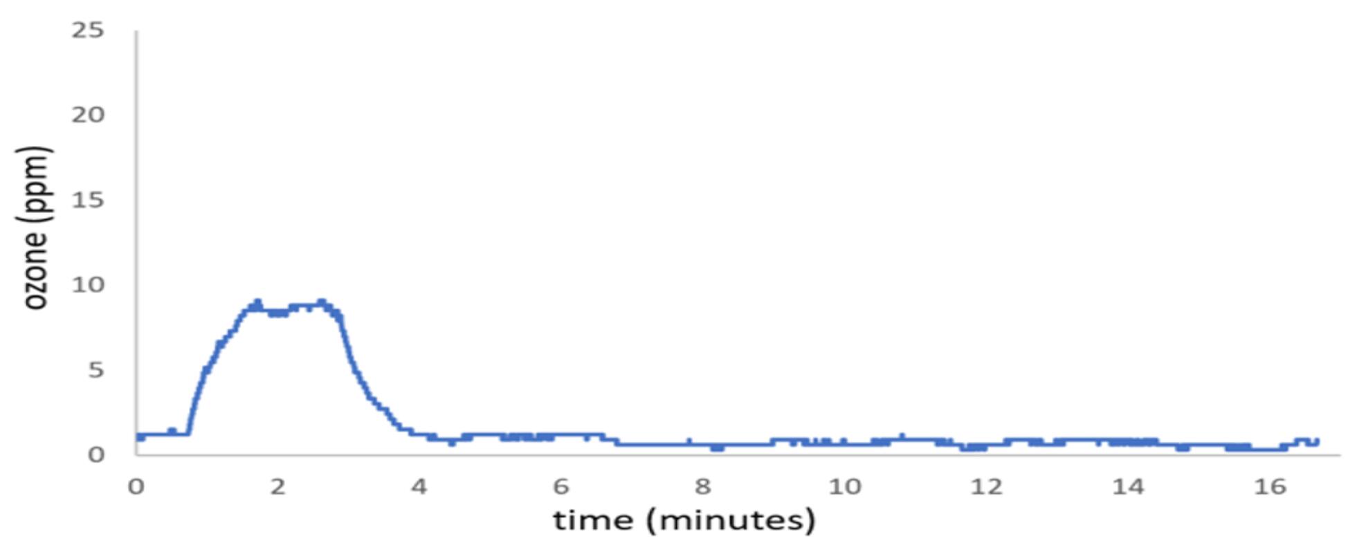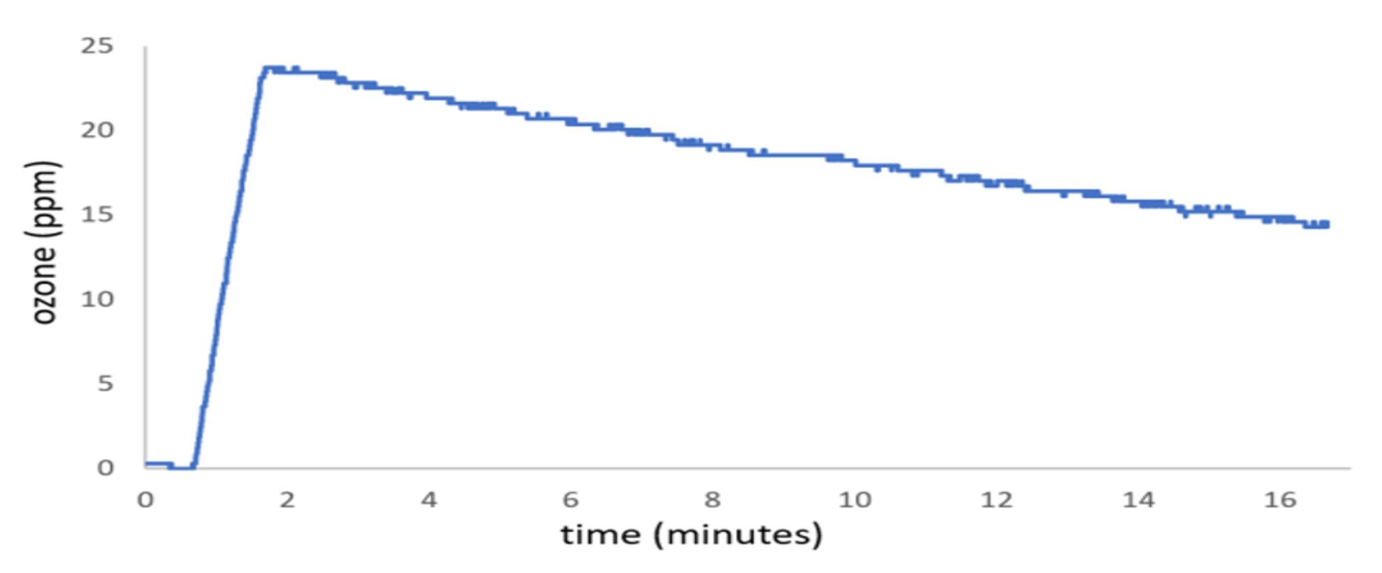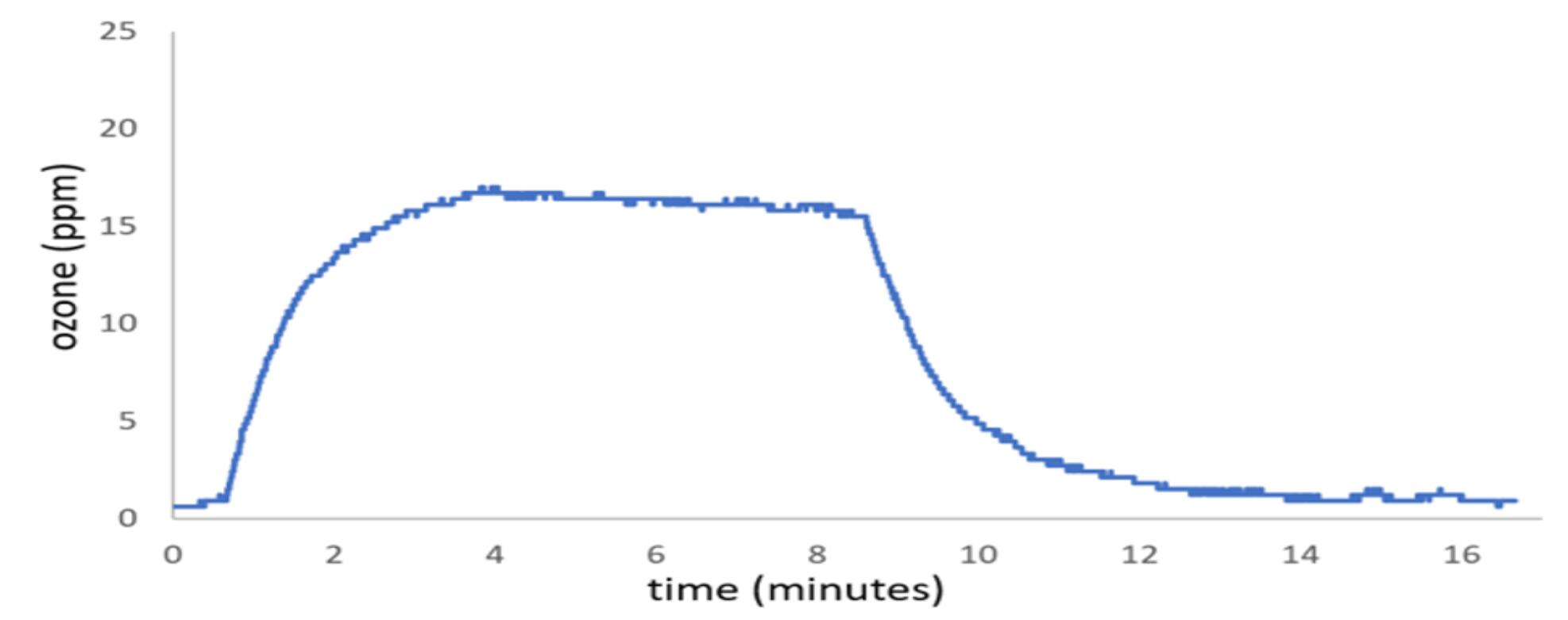 圖1.在一個24L 儲物盒中,在充滿和衰減期間,臭氧濃度隨時間變化的過程,蓋緊蓋子,並(bìng)使(shǐ)用指定的臭氧鼓泡器產生(shēng)600 mg / hr的臭氧。打開發生器電源後,臭氧濃度立即開始上升,並(bìng)線性上升至大約(yuē)24 ppm的水平,此時關閉了臭(chòu)氧發生器電源,並使臭氧濃(nóng)度下降。請注意,該盒子是空的,除了臭氧傳(chuán)感器和一個混合風扇陣列已經經過大約10個臭(chòu)氧(yǎng)充電周期(qī)。