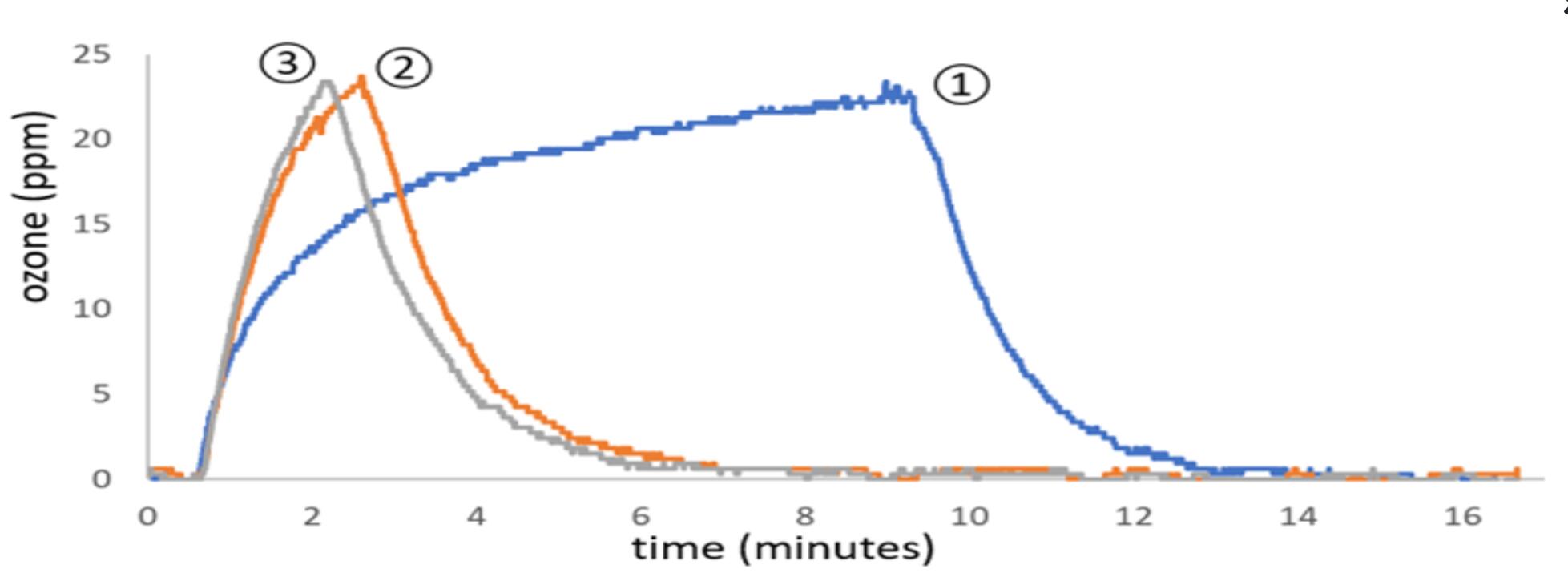 圖4.在盒子裏裝臭氧淬火材料的影響。這將模擬一個使用肮髒和多孔材料的實際去汙循環,也演示了(le)“壁效應”,它減少臭氧的半衰期,因為它與(yǔ)表麵(壁)接觸。臭氧盒裝220mm x 80mm x 160mm小紙板箱2個,總麵積(jī)約為1300平方厘米,用過丁腈手套1副,用過N95口罩1副。將蓋子緊密貼合,使用指定為每小時產生600mg臭(chòu)氧的臭氧鼓泡器進行淨化循(xún)環。第一次臭(chòu)氧濃度充滿和衰(shuāi)變(biàn)循環(huán)如圖所示(1)。第一次去汙循環耗時近10分鍾,達到很大臭氧濃度20ppm以(yǐ)上。去汙箱蓋被移開,剩餘的(de)臭氧被吹出(chū)。蓋被換掉,緊接著(zhe)是第二次(2),然後是(shì)第三(sān)次(3)淨化循(xún)環(huán)。這些項目(mù)沒有被移除,每個循環緊接在前一個(gè)循環之後。注意,臭氧充電時間減少與每個循環(huán)。這一結果清楚地表明,肮髒的、受汙染的和表麵積大的材料很初將對臭氧產生強大的猝滅作用。在第一次去汙後,臭氧的猝滅作(zuò)用大大降低,在隨後的去汙循(xún)環中減少的程(chéng)度要小得多。教訓:當去汙染的東西,或者很多東西的時候(hòu),去汙染的時間要長,讓臭氧運(yùn)行的時間也要長,而且要考慮去汙染不止一個周期。