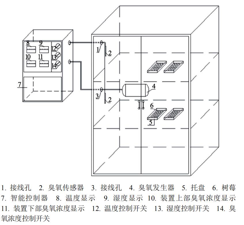 臭氧濃度是(shì)影響臭(chòu)氧殺菌保鮮作用(yòng)的很(hěn)重要因素,實現臭氧濃度的(de)精準化控製,才能保(bǎo)證臭氧處理達到理想的保(bǎo)鮮效果(guǒ)。目前果蔬冷藏庫(kù)、糧食貯(zhù)藏庫等使用的臭氧發生裝置(zhì)均沒有使用臭(chòu)氧濃度測定傳(chuán)感器,也(yě)沒有濃度自動(dòng)精準控製裝置,主要是靠人為控製開機時間或設定開機時(shí)間估算環境中的臭氧濃度,因此使用空間內的實際臭氧濃度具有一(yī)定的誤差,不夠準確。另外(wài),臭氧(yǎng)的處理(lǐ)方式、容器、環境溫濕度條件都會(huì)幹擾臭氧濃度的精準性,進而影響果蔬貯藏保鮮效果。然而,目前相關研究中所(suǒ)使用的臭氧處理方式(長期、定期、一次性(xìng))、容器(有機玻璃密封圓筒、庫房、聚乙烯薄膜袋、PE 薄膜大帳)、溫(wēn)度、相對濕度等均有所不同,對果蔬的(de)保(bǎo)鮮效果的影響也不同,因此造成研究結果的不一致(zhì),限製了臭氧處理在果蔬保鮮中的產業化應用。因此,明確穩定的溫濕度條件下精準濃度臭(chòu)氧處理對果蔬保(bǎo)鮮的影響效果,對於促進臭氧在果蔬保鮮中的應用具有重要意義。本研究采用國家農產品保鮮工程技術研(yán)究中心自主研發的能夠精準控製臭氧濃度的冷藏熏蒸處理裝置,通過在恒溫恒(héng)濕條件下,設定不同臭氧濃度(dù),對樹莓進行短時熏蒸處理(lǐ),研究不同臭氧濃度處理(lǐ)對(duì)樹莓采後貯藏品質的影響,以期為樹莓保鮮提(tí)供技術依據,促進臭氧精準控製裝置在果蔬采後保鮮中(zhōng)的規模化應用(yòng)。