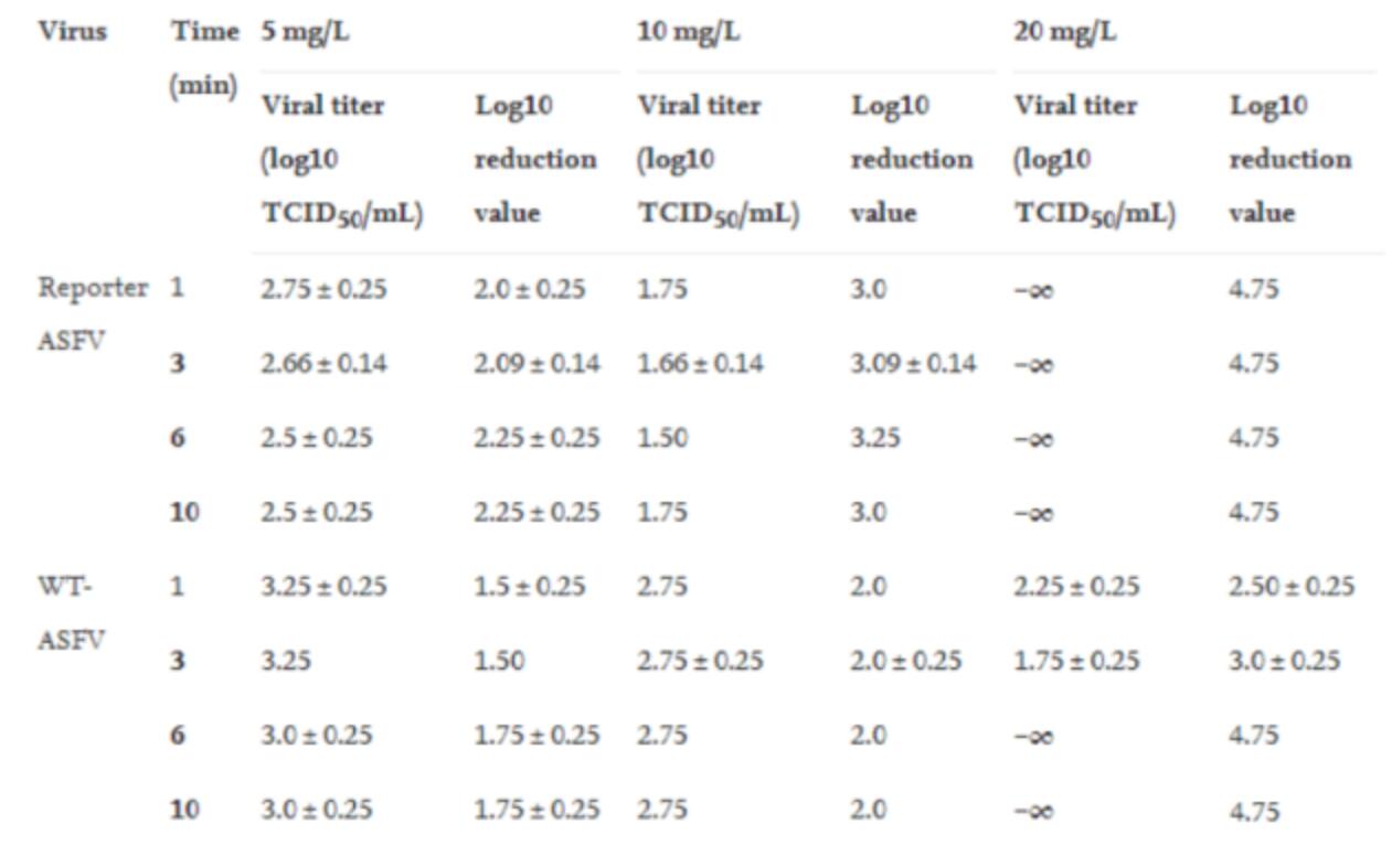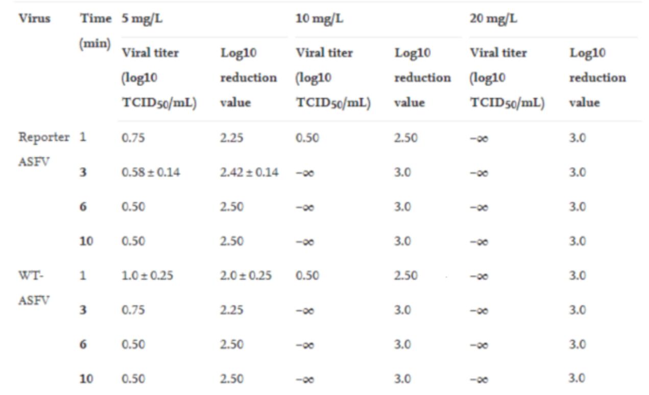 臭氧水(shuǐ)對10^6.75 TCID50/mL非瘟(wēn)病毒的滅(miè)活作用